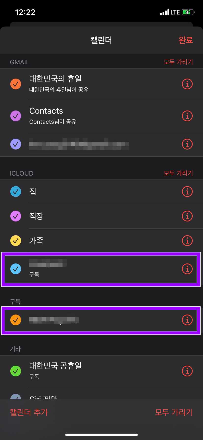 캘린더 앱에서 지울 수 있는 경우는 ICLOUD 항목으로 추가된 경우 바로 삭제할 수 있어요. 우측의 i 버튼을 눌러주세요.