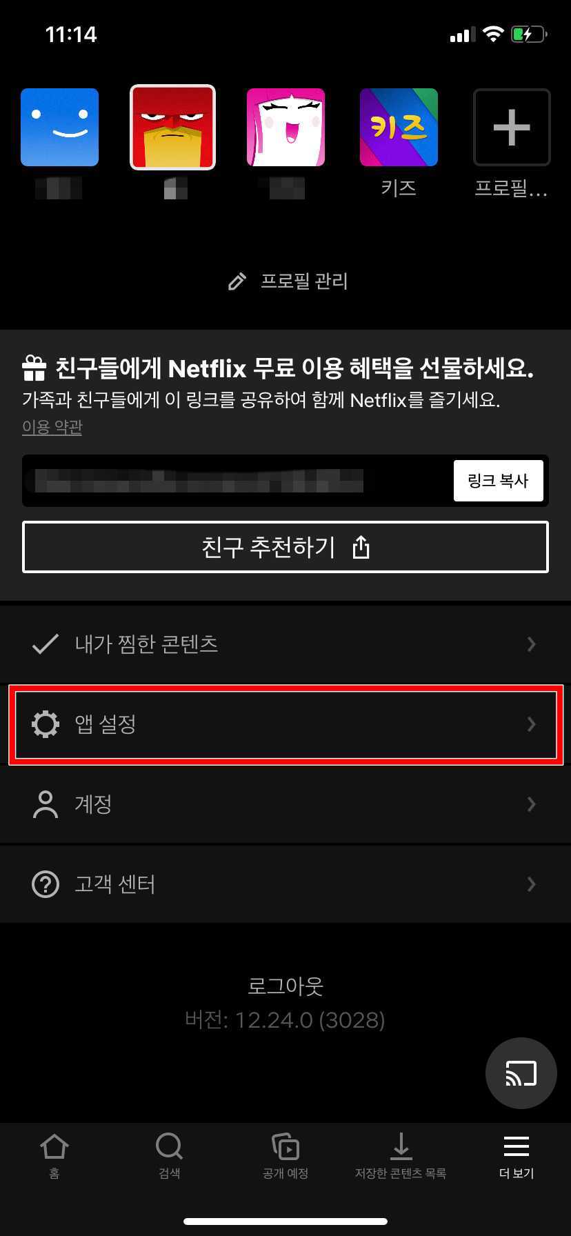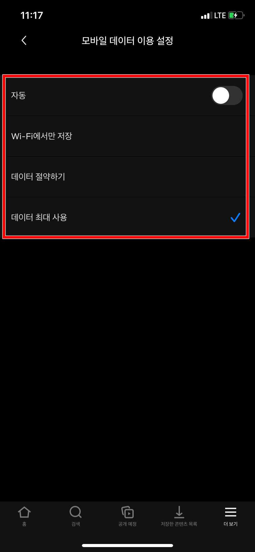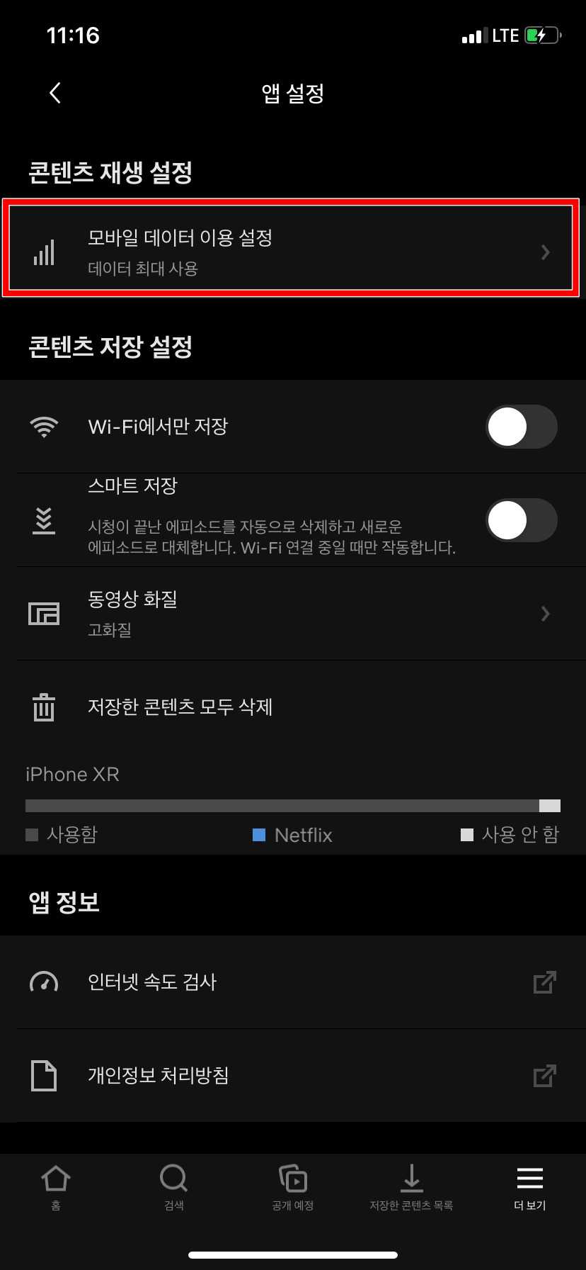 먼저 넷플릭스 어플을 실행해 주세요. 그리고 우측 하단에 있는 메뉴 버튼을 누른 후 "앱 설정" - "콘텐츠 재생 설정"에 있는 "모바일 데이터 이용 설정"으로 들어가 주세요.