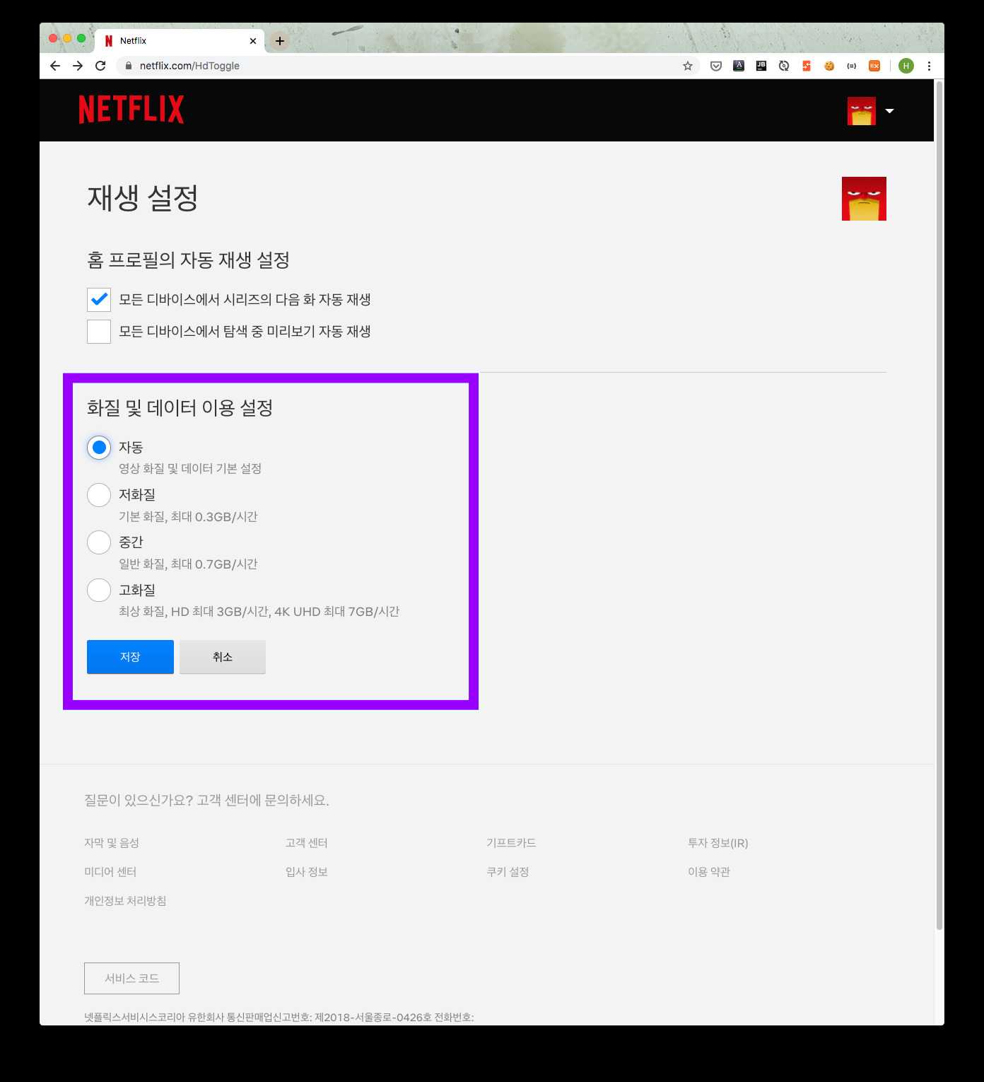 위에서 보셨듯이 모바일과 PC의 설정을 따로 가능하게 돼 있어요. 그래서 저 같은 경우 모바일 설정을 자동 또는 데이터 절약하기로 해 두고, PC에서는 고화질로 설정해서 사용 중이에요. 데이터 요금을 무제한으로 사용하더라도 밖에서는 고화질을 설정했을 때 자주 끊기는 경우가 발생해요. 하지만 집에서는 HD 또는 UHD를 충분히 소화할만한 속도와 데이터가 제공되고 있어서 가장 좋은 설정인 것 같아요.