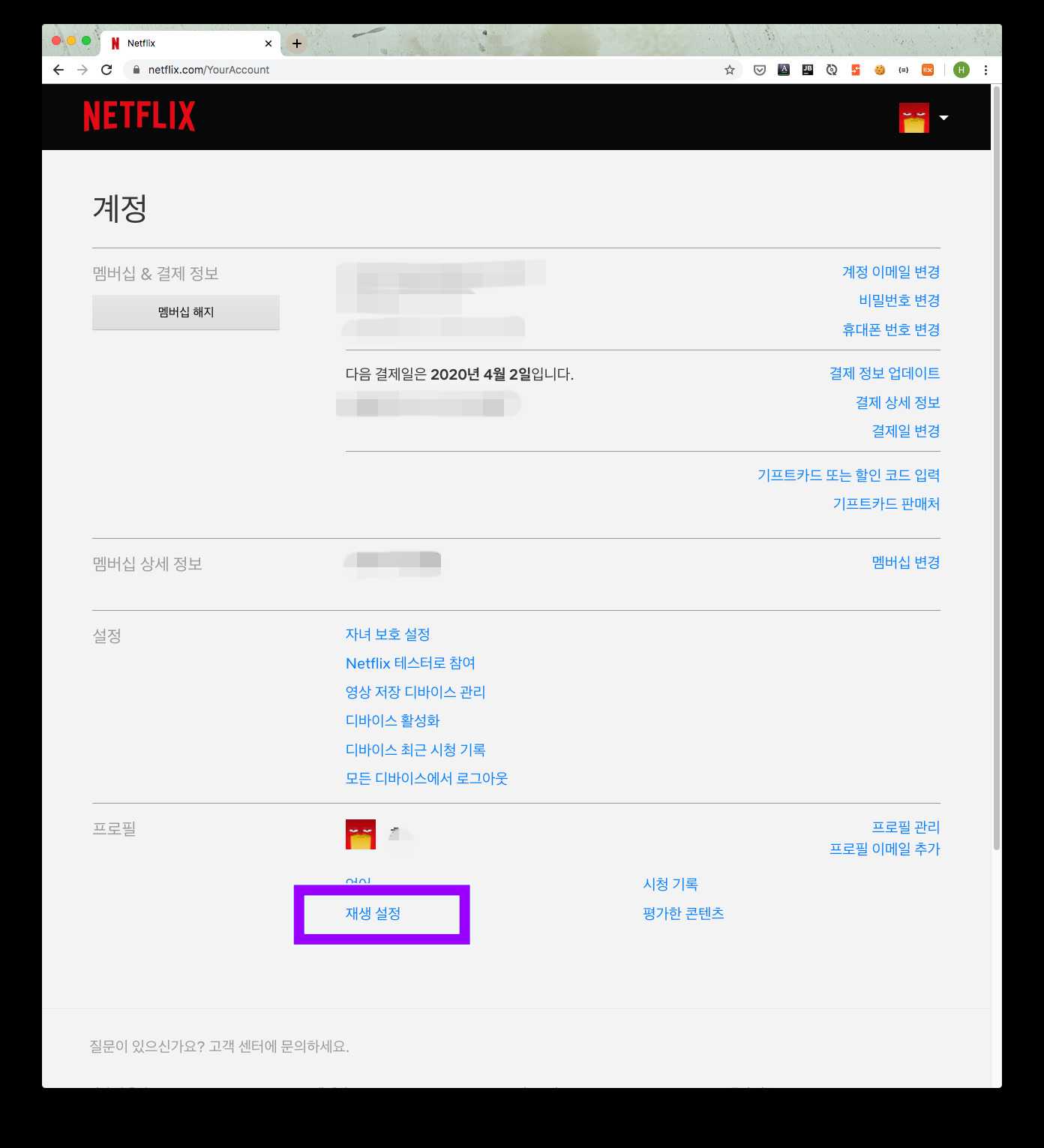 그리고 우측 상단에 프로필에 마우스를 올리고 나타나는 메뉴 중에서 "계정" 메뉴로 들어간 후, 화면 하단에 있는 "재생 설정" 메뉴로 들어가 주세요.